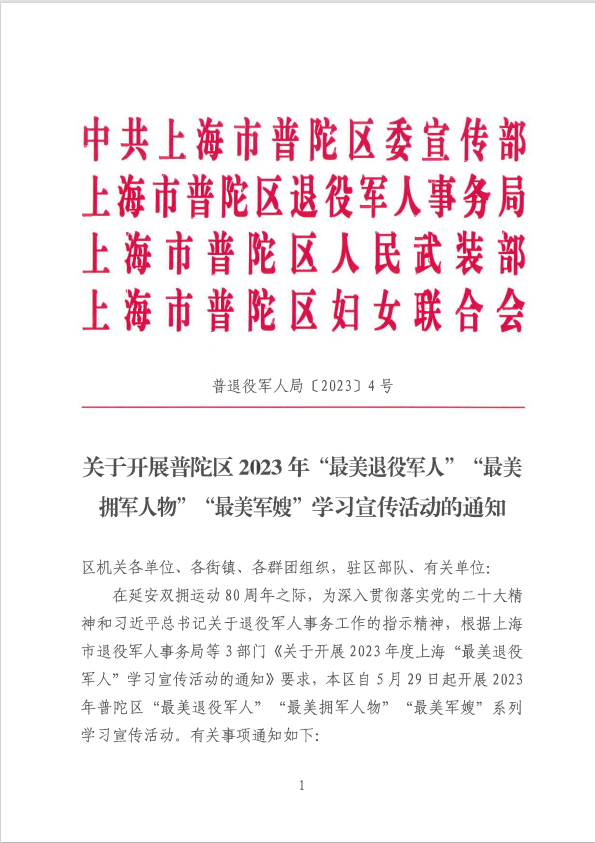 在延安双拥运动80周年之际,为深入贯彻落实党的二十大精神和习近平总书记关于退役军人事务工作的指示精神,根据上海市退役军人事务局等3部门《关于开展2023年度上海“最美退役军人”学习宣传活动的通知》要求,本区自5月29日起开展2023年普陀区“最美退役军人”“最美拥军人物”“最美军嫂”系列学习宣传活动。有关事项通知如下: