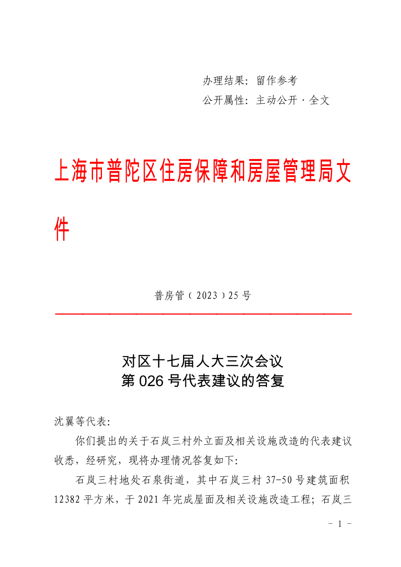 你们提出的关于石岚三村外立面及相关设施改造的代表建议收悉,经研究,现将办理情况答复如下: