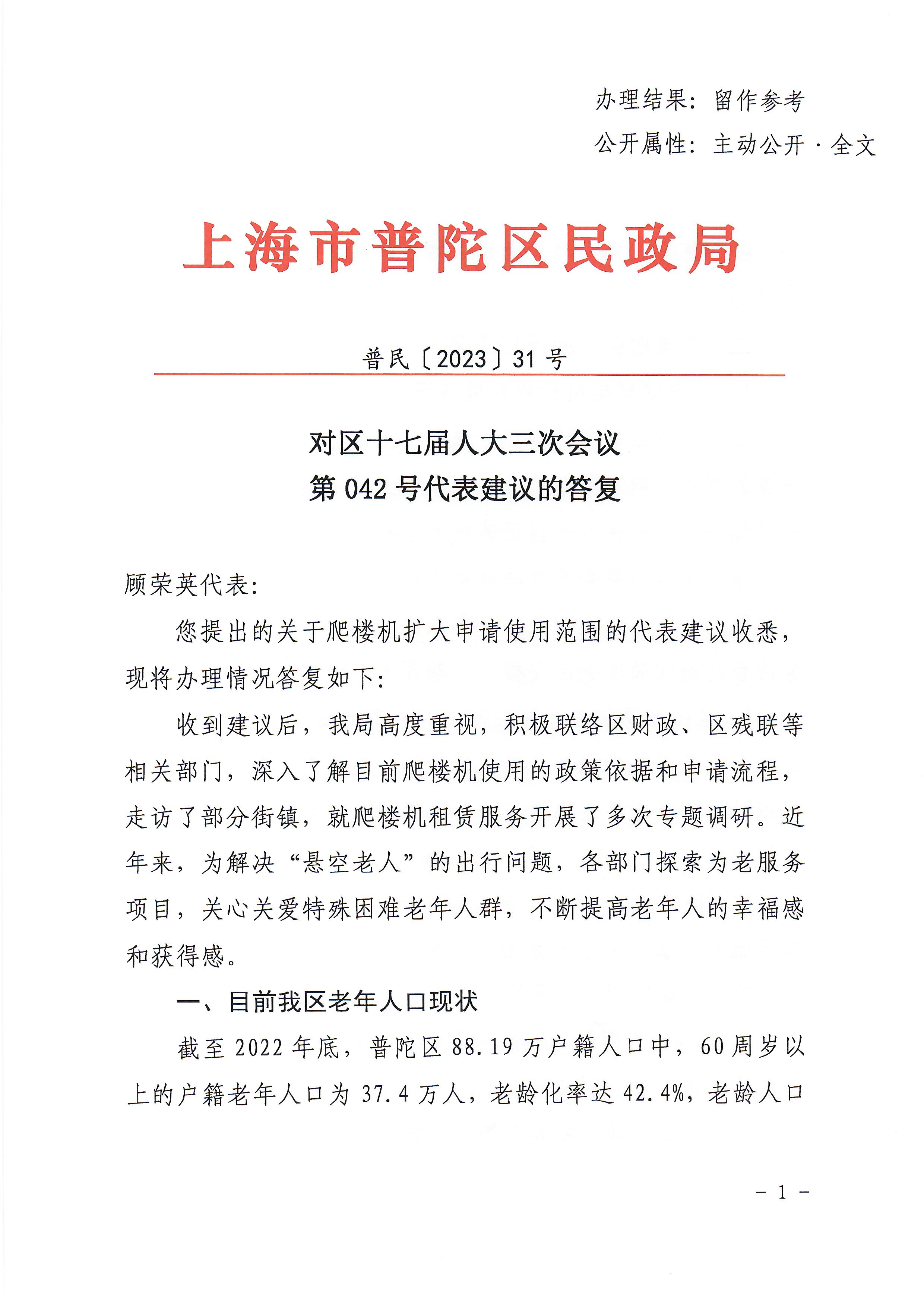 收到建议后,我局高度重视,积极联络区财政、区残联等相关部门,深入了解目前爬楼机使用的政策依据和申请流程,走访了部分街镇,就爬楼机租赁服务开展了多次专题调研。近年来,为解决“悬空老人”的出行问题,各部门探索为老服务项目,关心关爱特殊困难老年人群,不断提高老年人的幸福感和获得感。