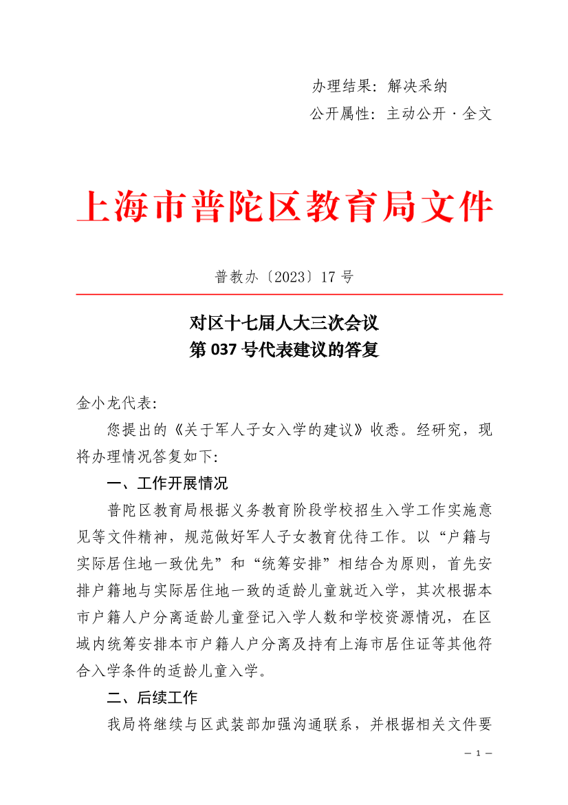 我局将继续与区武装部加强沟通联系,并根据相关文件要求与原则,做好招生政策解读宣传,对于个案一事一议,妥善优待现役军人子女入学事宜。