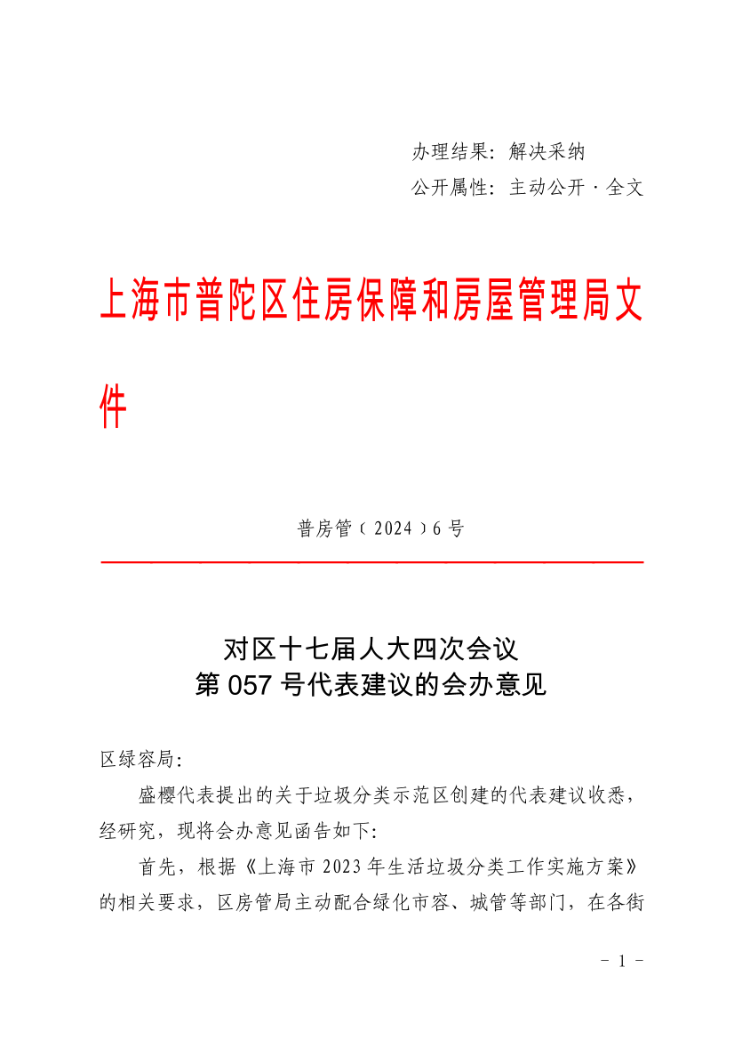 盛樱代表提出的关于垃圾分类示范区创建的代表建议收悉,经研究,现将会办意见函告如下: