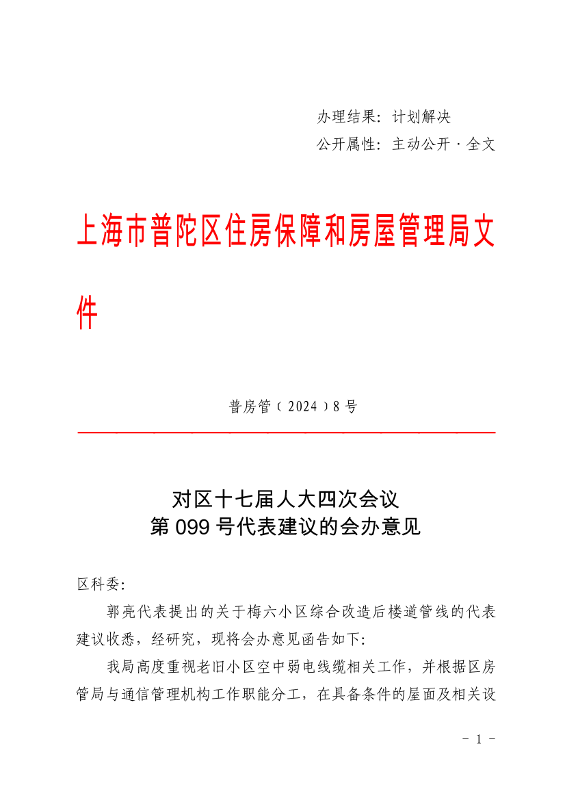 郭亮代表提出的关于梅六小区综合改造后楼道管线的代表建议收悉,经研究,现将会办意见函告如下: