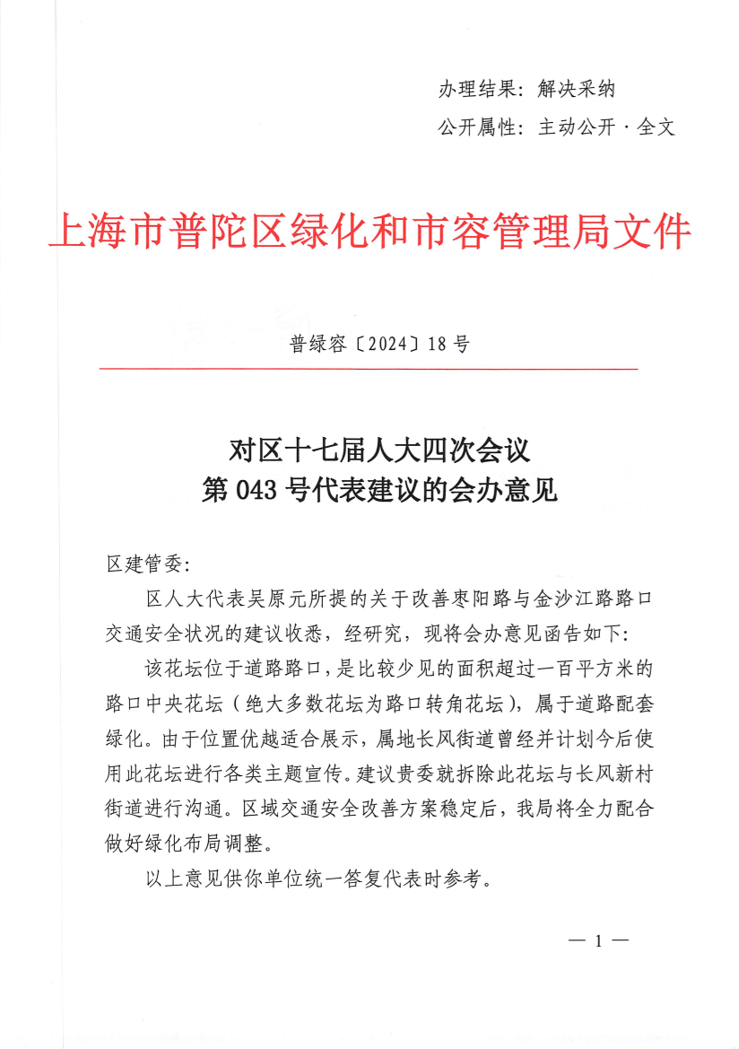 该花坛位于道路路口,是比较少见的面积超过一百平方米的路口中央花坛(绝大多数花坛为路口转角花坛),属于道路配套绿化。由于位置优越适合展示,属地长风街道曾经并计划今后使用此花坛进行各类主题宣传。建议贵委就拆除此花坛与长风新村街道进行沟通。区域交通安全改善方案稳定后,我局将全力配合做好绿化布局调整。