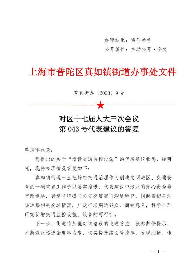真如镇街道一直把静态交通治理作为创建文明城区、交通安全的一项重点工作予以落实推进,代表建议中涉及的穿心街为非市政道路,街道将积极与公安交警部门沟通研究,同时密切关注该道路相关交通情况,广泛征求周边群众、商铺意见,科学合理研究新增交通监控设施、设备的可行性。