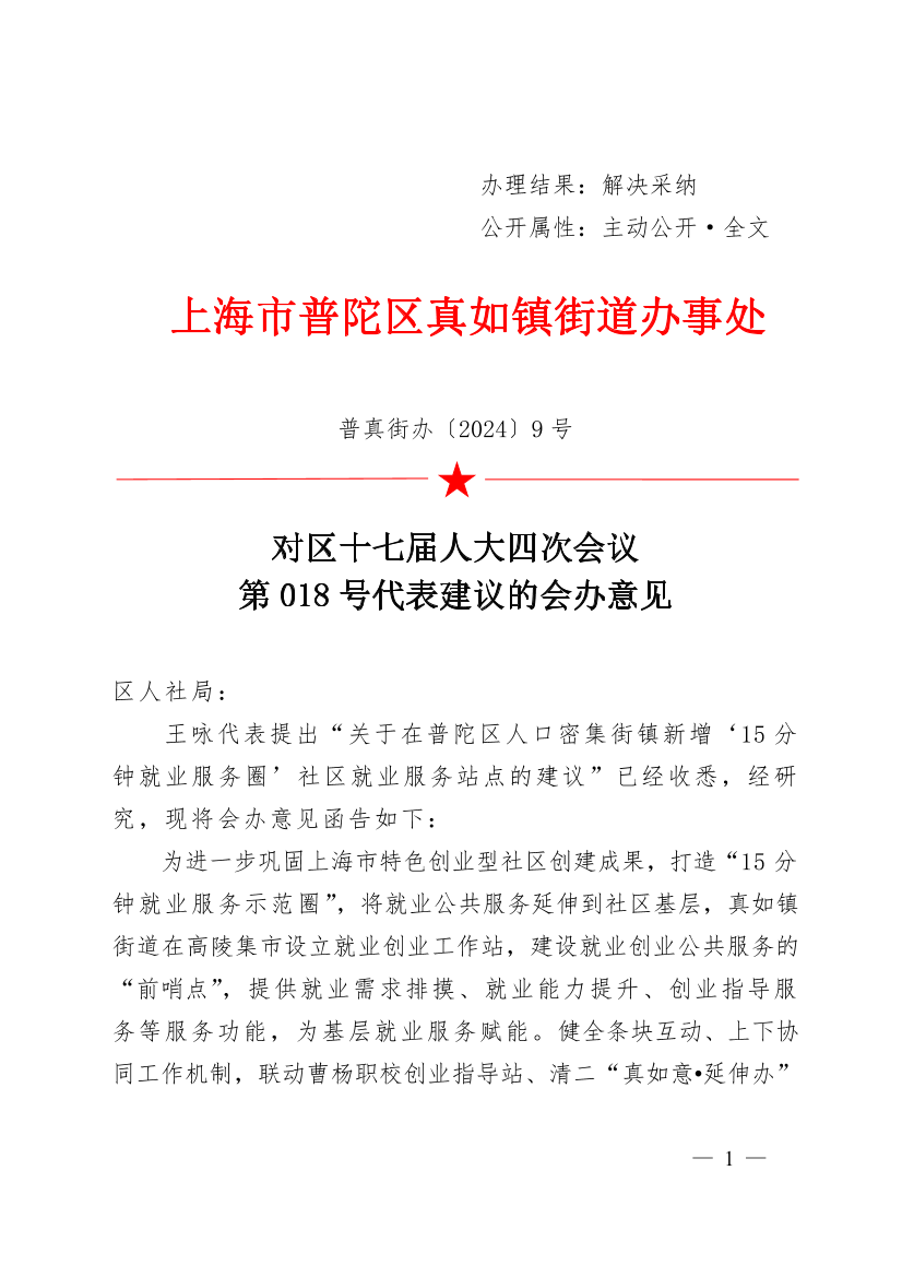 王咏代表提出“关于在普陀区人口密集街镇新增‘15分钟就业服务圈’社区就业服务站点的建议”已经收悉,经研究,现将会办意见函告如下: