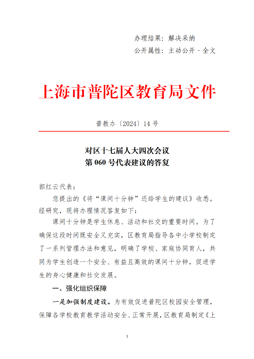 您提出的《将“课间十分钟”还给学生的建议》收悉。经研究,现将办理情况答复如下: