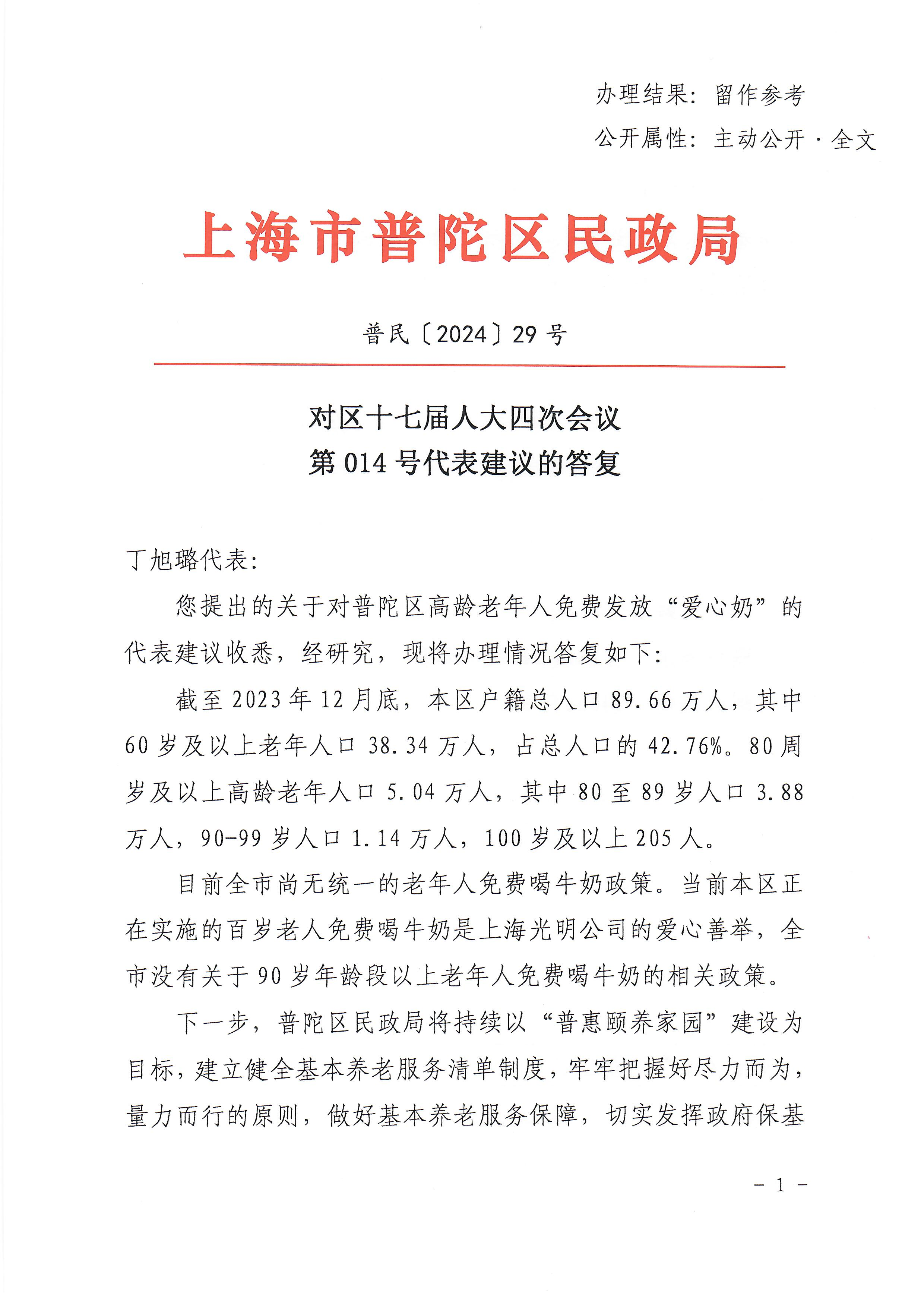 您提出的关于对普陀区高龄老年人免费发放“爱心奶”的代表建议收悉,经研究,现将办理情况答复如下: