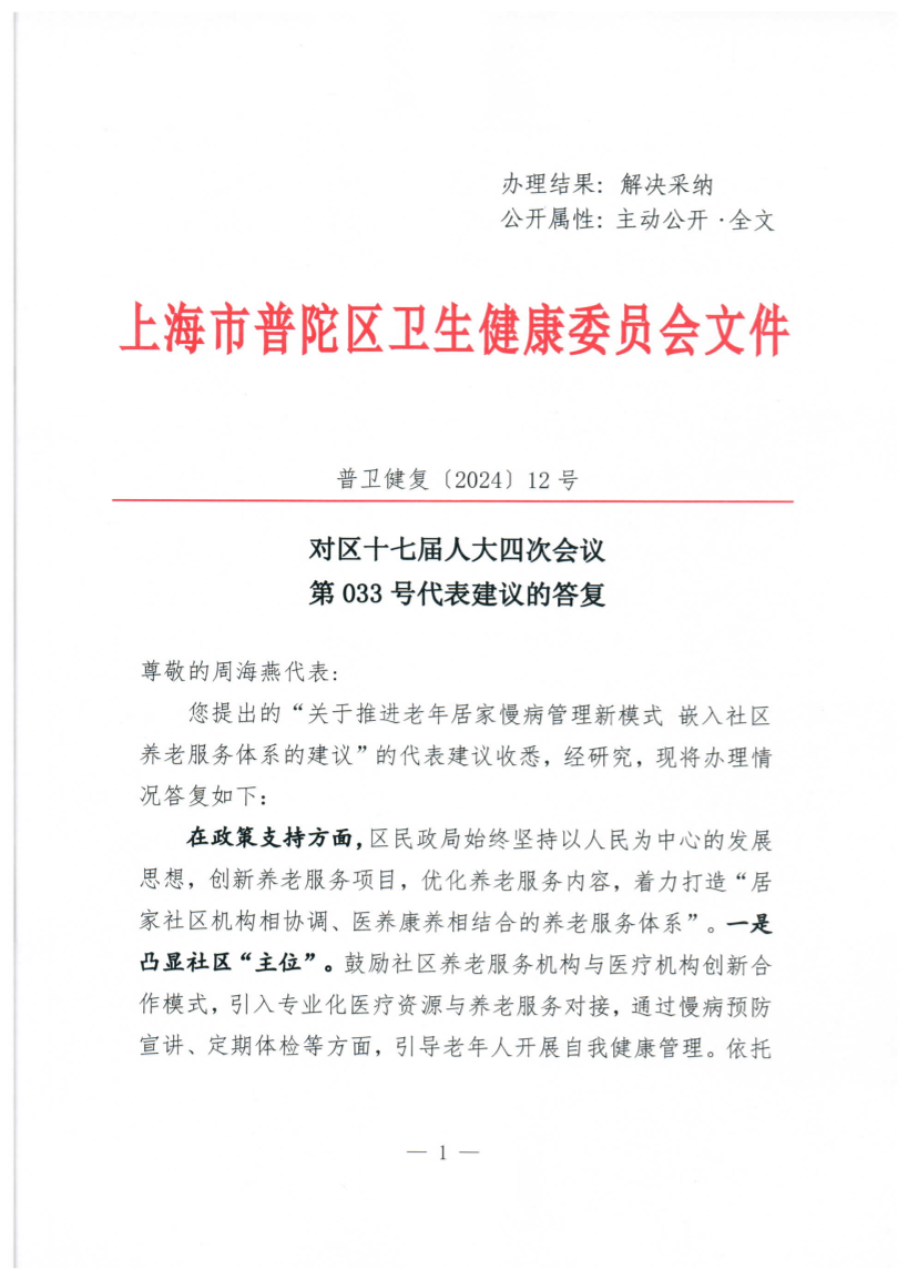 您提出的“关于推进老年居家慢病管理新模式 嵌入社区养老服务体系的建议”的代表建议收悉,经研究,现将办理情况答复如下: