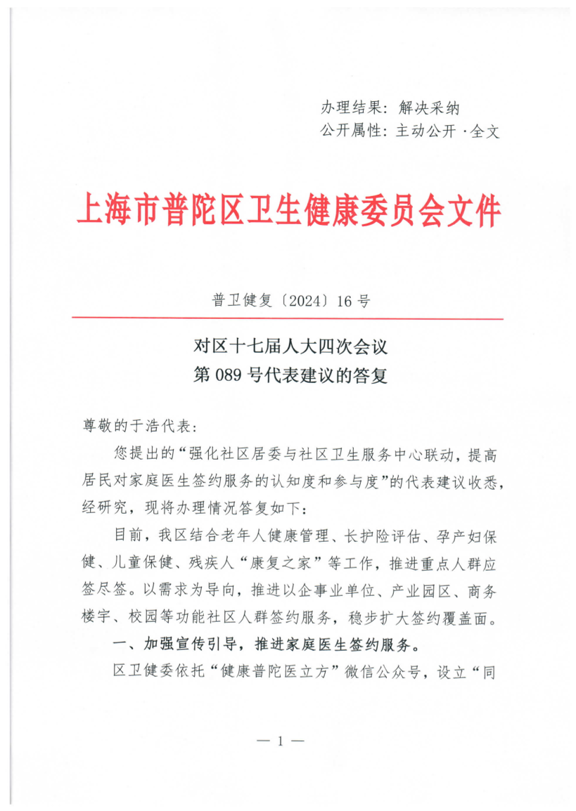 您提出的“强化社区居委与社区卫生服务中心联动,提高居民对家庭医生签约服务的认知度和参与度”的代表建议收悉,经研究,现将办理情况答复如下:
