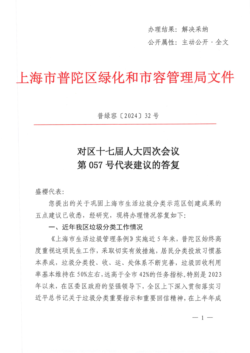 您提出的关于巩固上海市生活垃圾分类示范区创建成果的五点建议已收悉,经研究,现将办理情况答复如下: