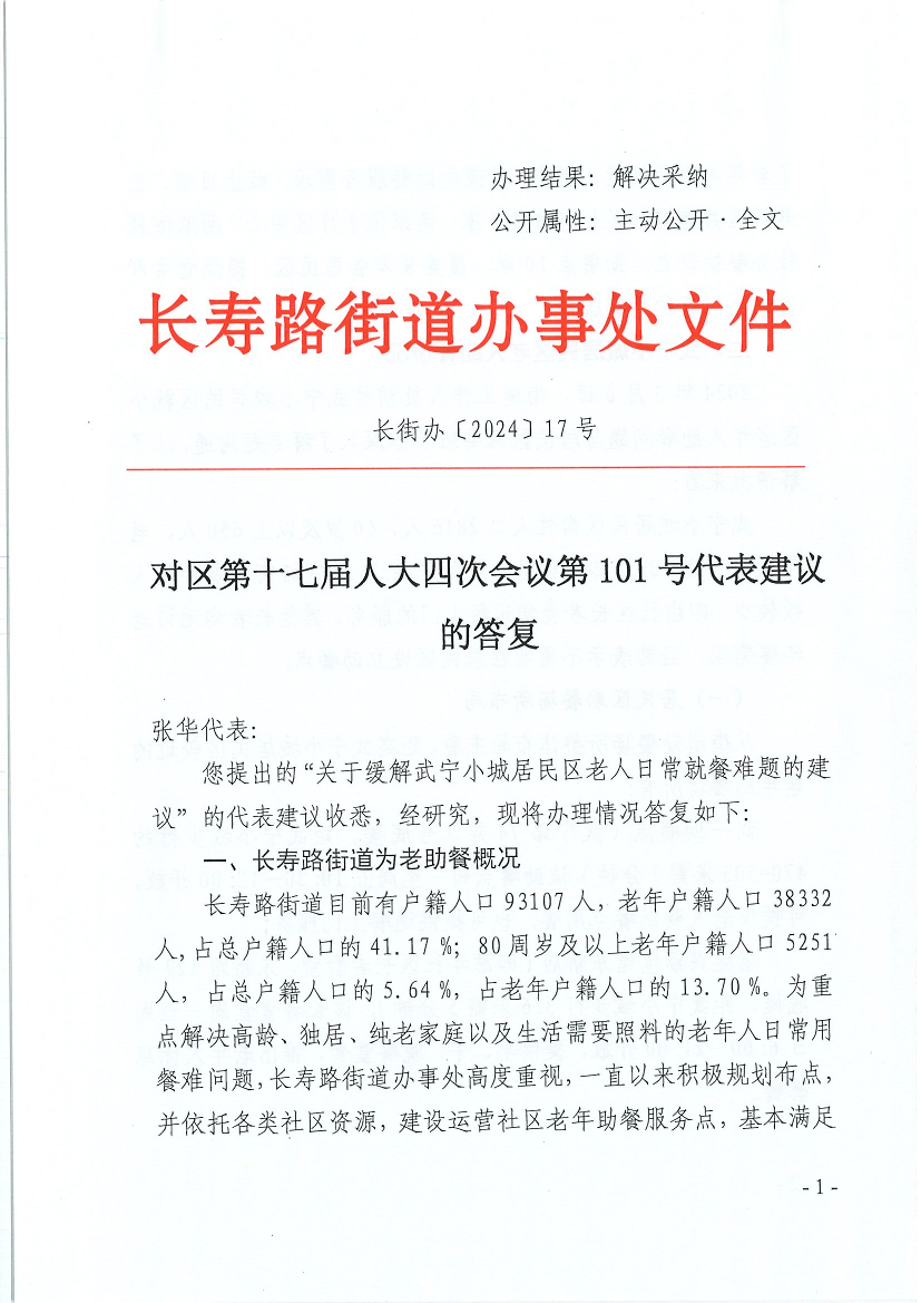 您提出的“关于缓解武宁小城居民区老人日常就餐难题的建议”的代表建议收悉,经研究,现将办理情况答复如下: