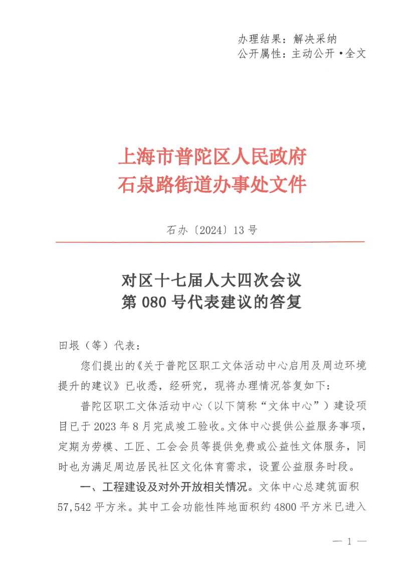 您们提出的《关于普陀区职工文体活动中心启用及周边环境提升的建议》已收悉,经研究,现将办理情况答复如下:
