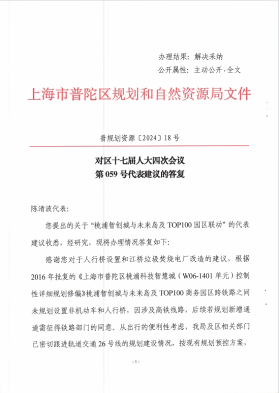 您提出的关于“桃浦智创城与未来岛及TOP100园区联动”的代表建议收悉,经研究,现将办理情况答复如下: