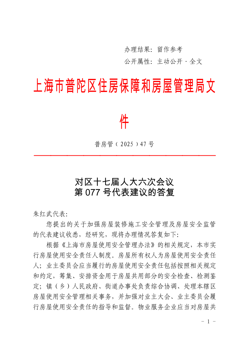 您提出的关于加强房屋装修施工安全管理及房屋安全监管的代表建议收悉,经研究,现将办理情况答复如下: