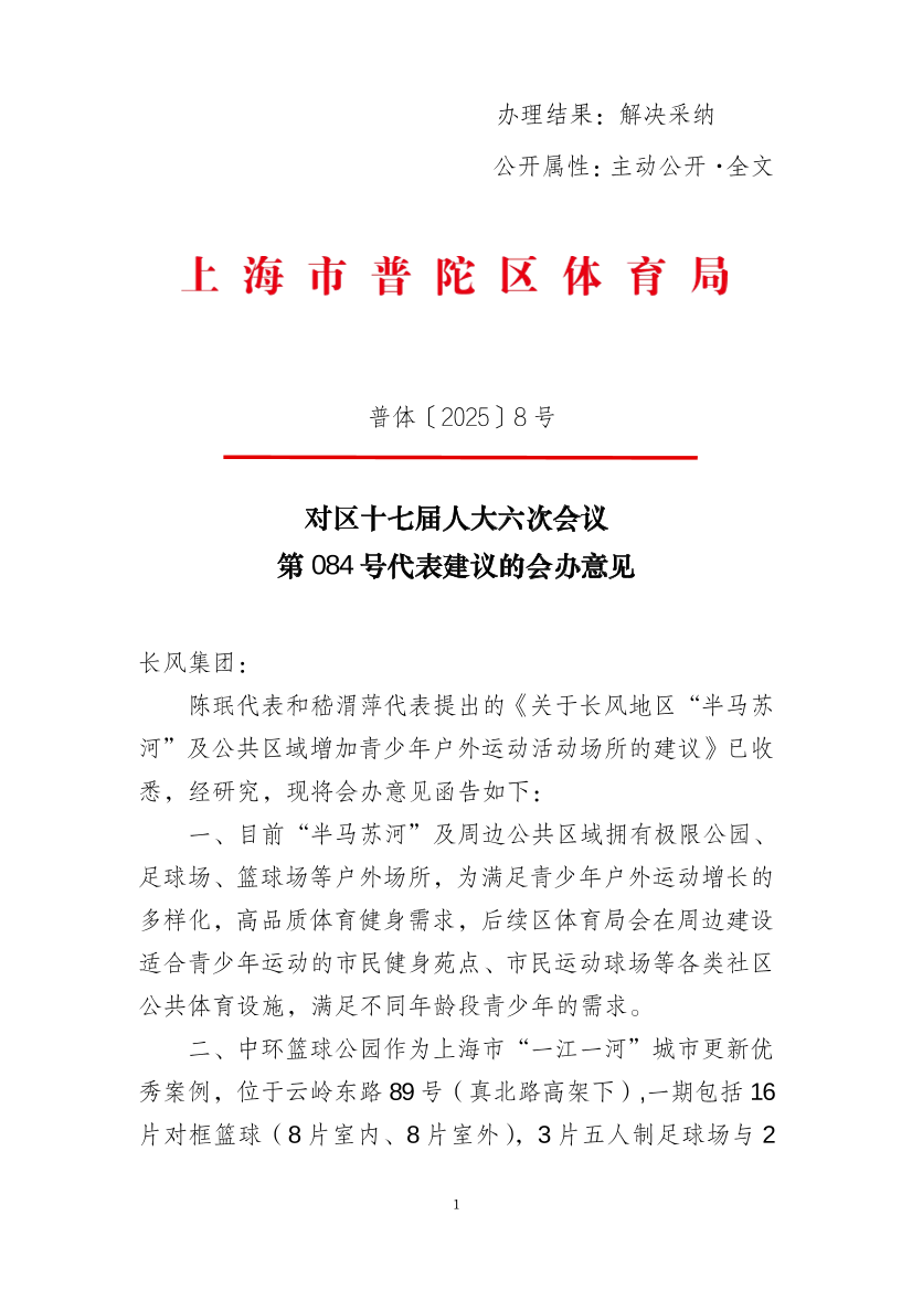 陈珉代表嵇渭萍代表提出的《关于长风地区“半马苏河”及公共区域增加青少年户外运动活动场所的建议收悉,经研究,现将会办意见函告如下: