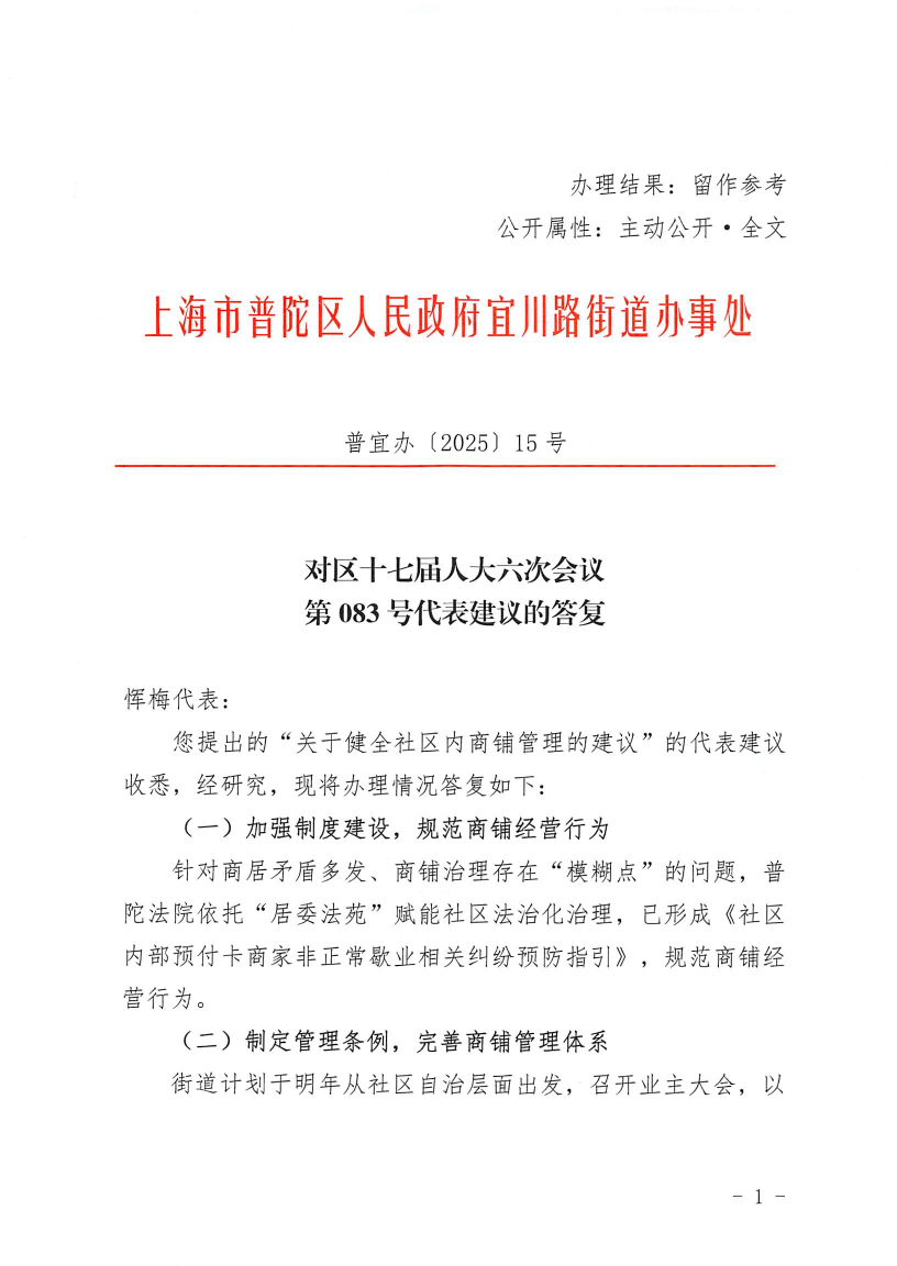 您提出的“关于健全社区内商铺管理的建议”的代表建议收悉,经研究,现将办理情况答复如下: