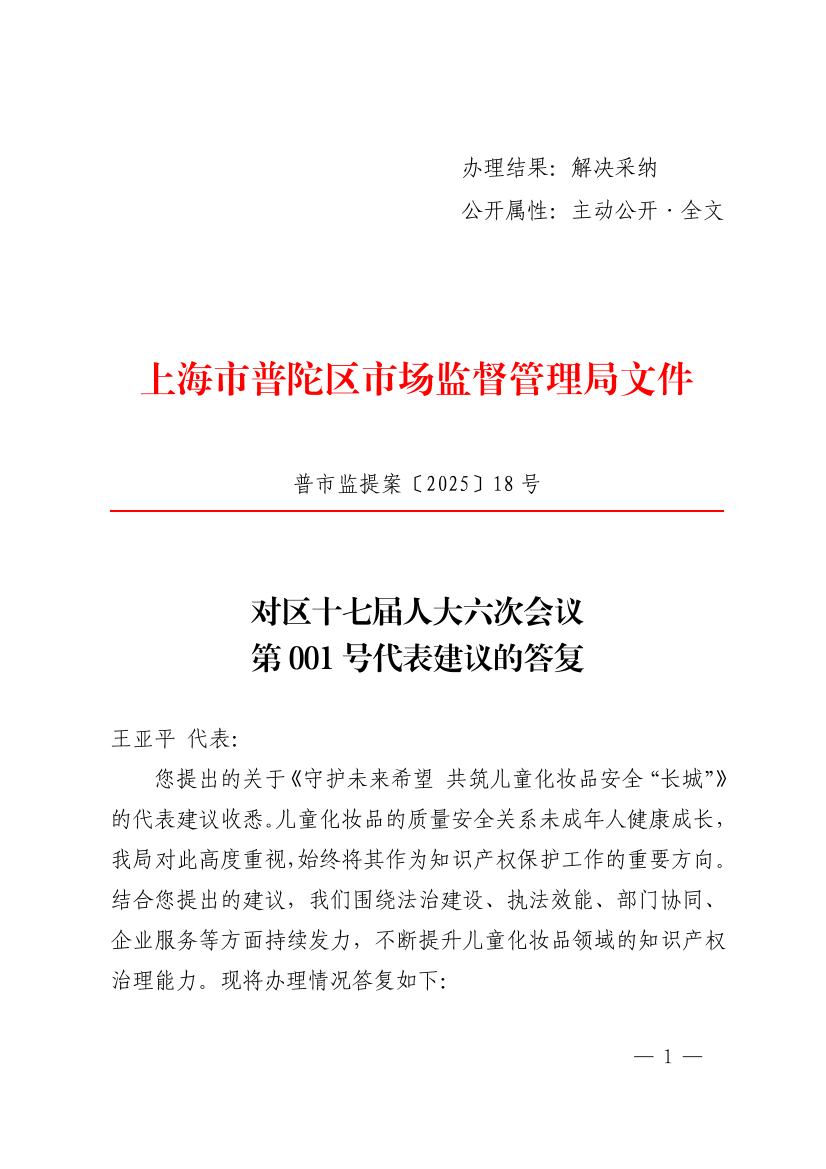 您提出的关于《守护未来希望 共筑儿童化妆品安全“长城”》的代表建议收悉。儿童化妆品的质量安全关系未成年人健康成长,我局对此高度重视,始终将其作为知识产权保护工作的重要方向。结合您提出的建议,我们围绕法治建设、执法效能、部门协同、企业服务等方面持续发力,不断提升儿童化妆品领域的知识产权治理能力。现将办理情况答复如下: