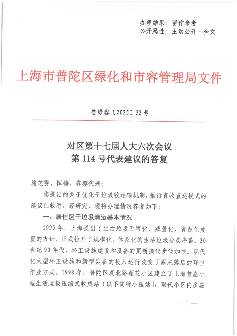感谢您对普陀生活垃圾分类和清运作业的关心与支持。我们将进一步推进生活垃圾清运作业规范化和长效化管理,继续为垃圾分类“新时尚”风景线增光添彩。也希望您继续关心和监督我们的工作,为我们的工作提出宝贵的建议。