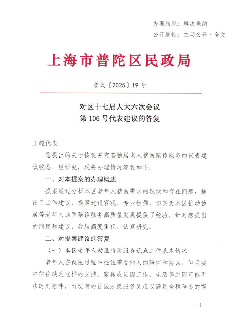 您提出的关于恢复并完善独居老人就医陪诊服务的代表建议收悉,经研究,现将办理情况答复如下: