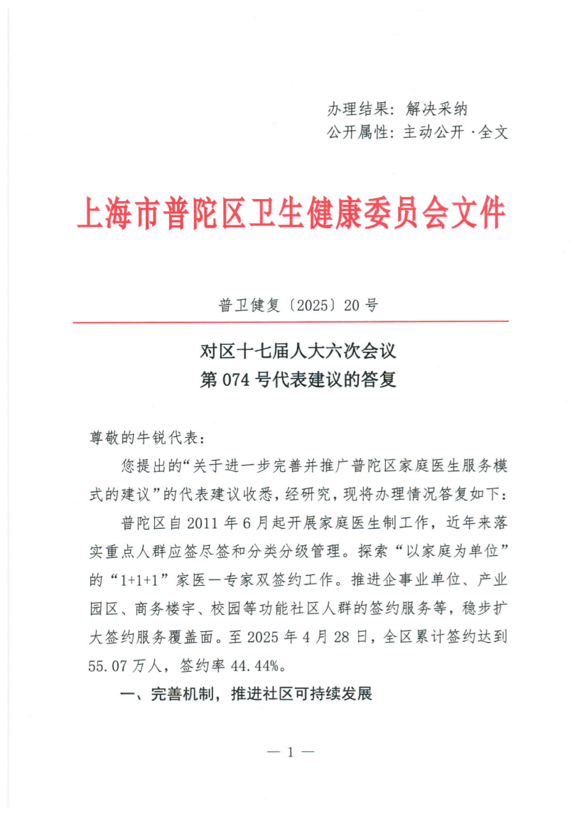 您提出的“关于进一步完善并推广普陀区家庭医生服务模式的建议”的代表建议收悉,经研究,现将办理情况答复如下: