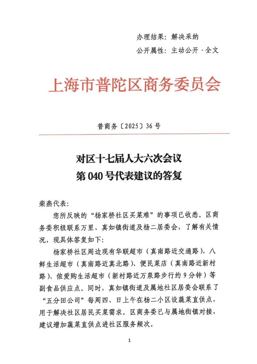 您所反映的“杨家桥社区买菜难”的事项已收悉。区商务委积极联系万里、真如镇街道及杨二居委会,了解有关情况,现具体答复如下: