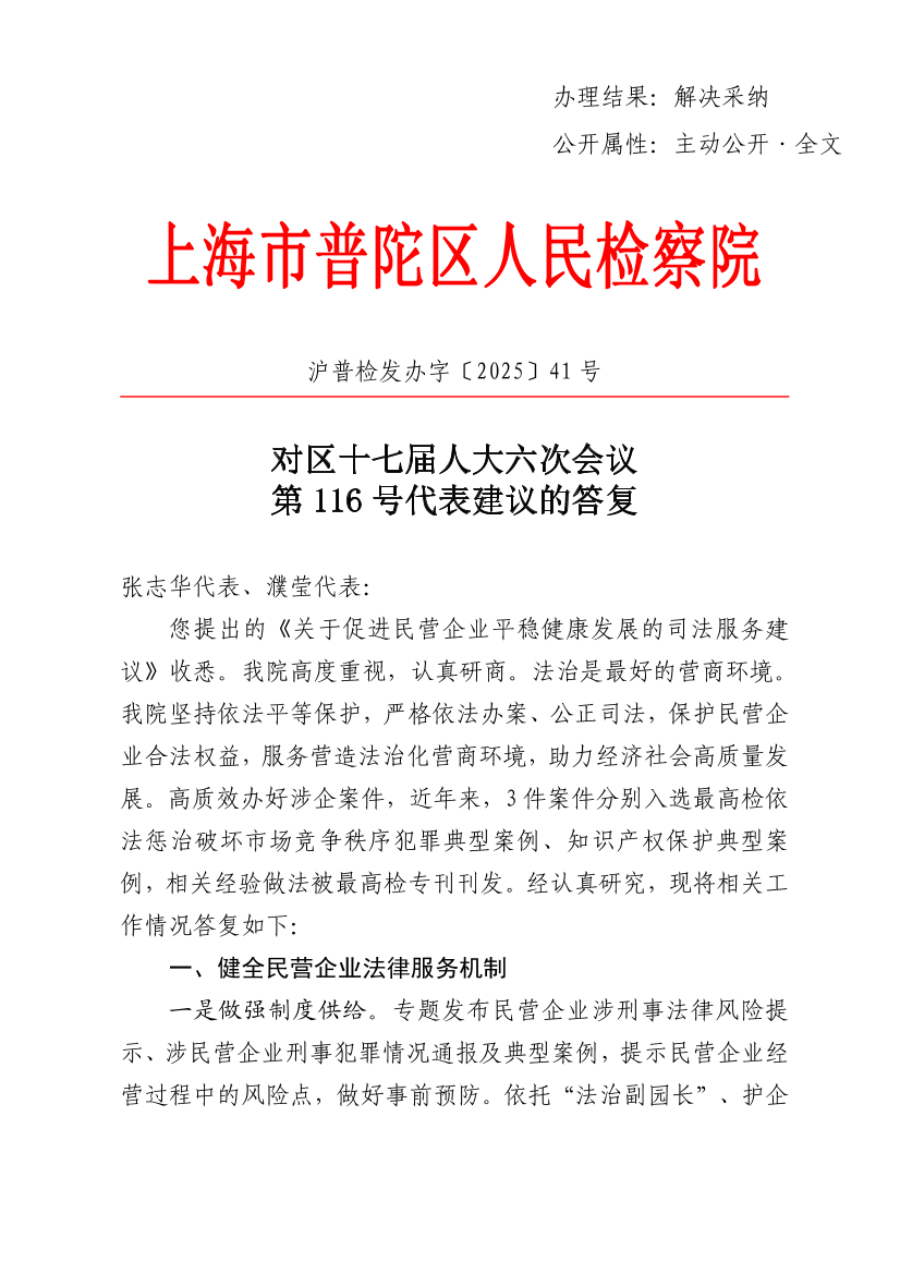 一是落实依法平等保护要求。完善落实本院《护航法治化营商环境建设十项举措》,合力充实全区营造优质法治营商环境的“法治保障包”,服务助推“全力以赴拼经济”。严惩破坏公平竞争领域犯罪。重点打击商业贿赂、侵犯知识产权、虚假广告、串通投标,以及利用网络实施的敲诈勒索、损害商誉、强迫交易等严重破坏公平竞争秩序犯罪。贯彻落实《刑法修正案(十二)》,依法惩治民营企业内部人员,特别是民营企业高管、财务、采购、销售、技术等关键岗位人员实施的职务侵占、挪用资金、非国家工作人员受贿以及背信损害公司利益等侵害企业利益犯罪,维护公平公正的市场环境。二是深化知识产权检察综合保护。依法惩治涉商标权、专利权、著作权、商业秘密犯罪,加强知识产权民事、行政诉讼监督,深化知识产权恶意诉讼专项监督。推动构建知识产权严保护、大保护、快保护、同保护格局,助力普陀区科创平台建设。三是强化法律监督。加强对涉企案件立案监督和侦查活动监督。充分发挥侦查监督与协作配合机制作用,推进涉企刑事“挂案”清理,对久侦不结案件全面排查、分类处置。加强与公安机关涉企案件信息共享,依法开展立案监督。