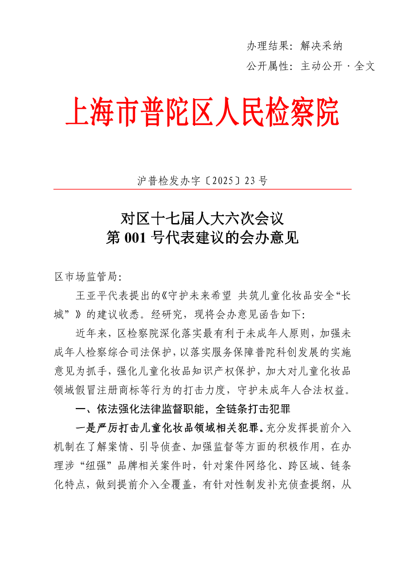 王亚平代表提出的《守护未来希望 共筑儿童化妆品安全“长城”》的建议收悉。经研究,现将会办意见函告如下: