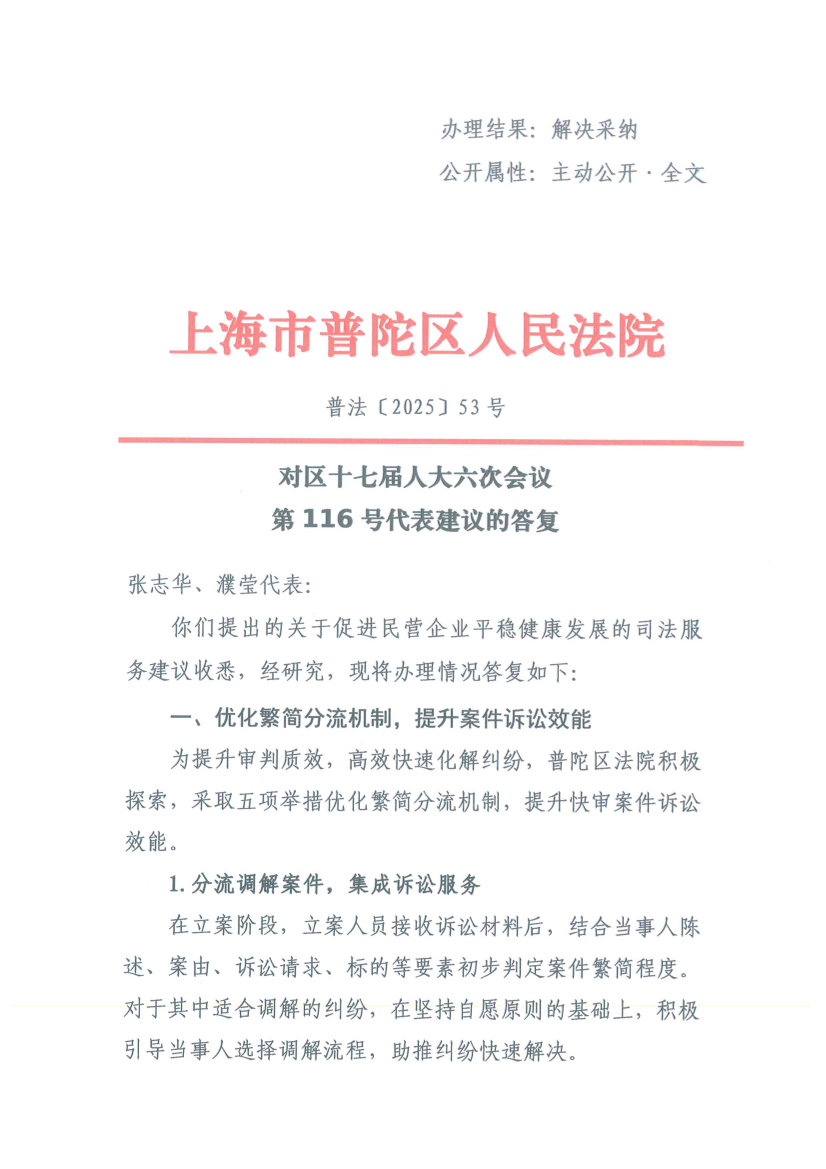 对于适宜调解的案件,充分调动社会解纷资源加以化解。依托我院已建立的“普陀区工商联总商会商事调解委员会”“融资租赁纠纷多元调处工作室”“巡回审判+”赋能“居委法苑””“桃浦镇劳动人事争议化解工作站”等多个特色多元调处工作室开展调解工作。今年商事庭将进一步探索市场化调解的新举措、新路径,以更精准的司法服务、更灵活的解纷机制,为企业送上“看得见、用得上”的司法保障,为区域经济高质量发展注入法治动能。
