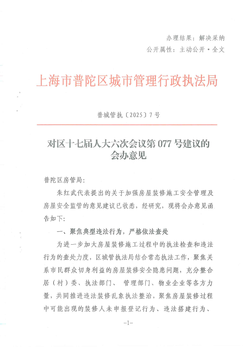 朱红武代表提出的关于加强房屋装修施工安全管理及房屋安全监管的意见建议已收悉,经研究,现将会办意见函告如下: