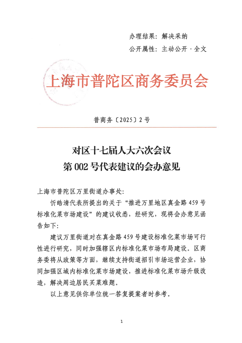 忻皓清代表所提出的关于“推进万里地区真金路459号标准化菜市场建设”的建议收悉,经研究,现将会办意见函告如下: