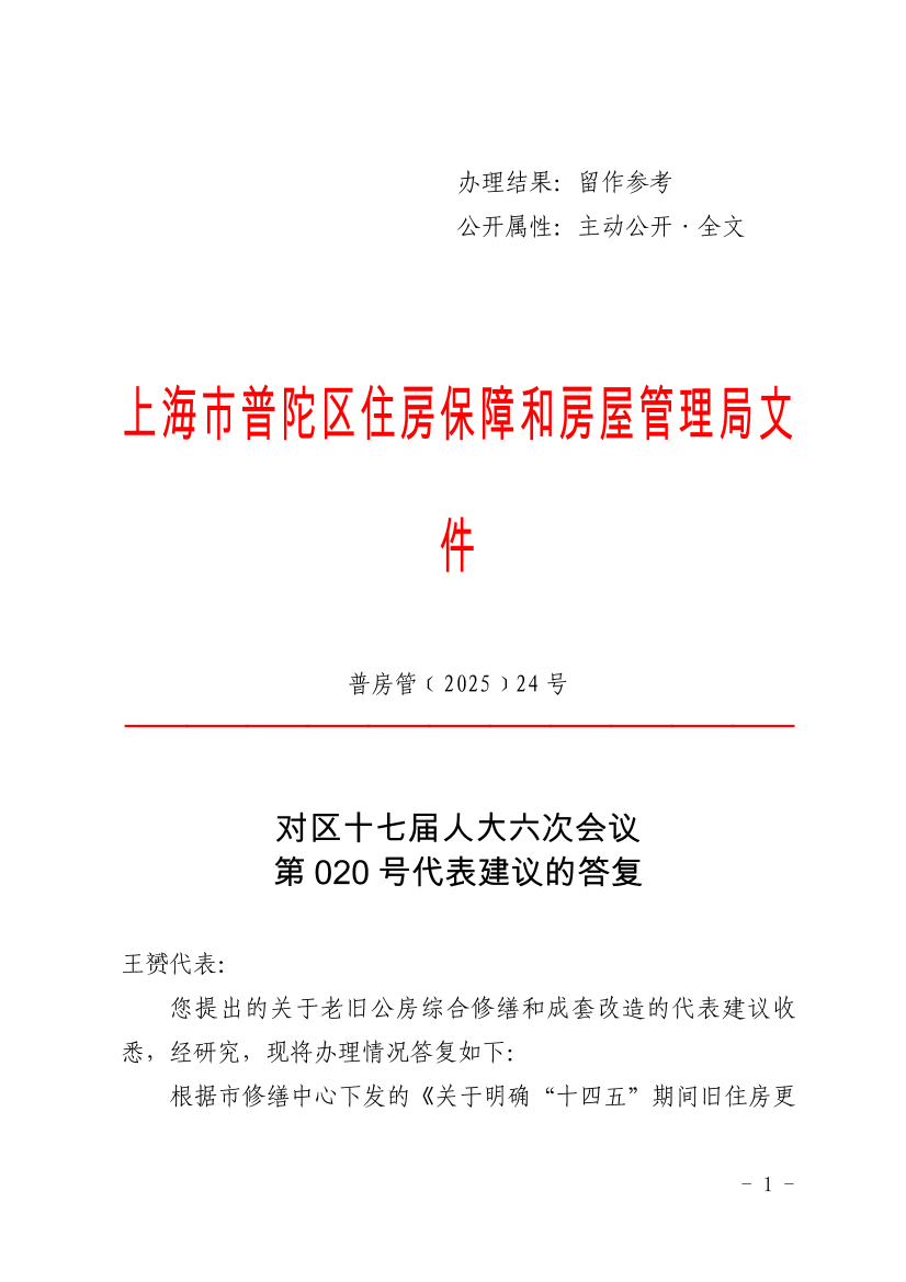 您提出的关于老旧公房综合修缮和成套改造的代表建议收悉,经研究,现将办理情况答复如下: