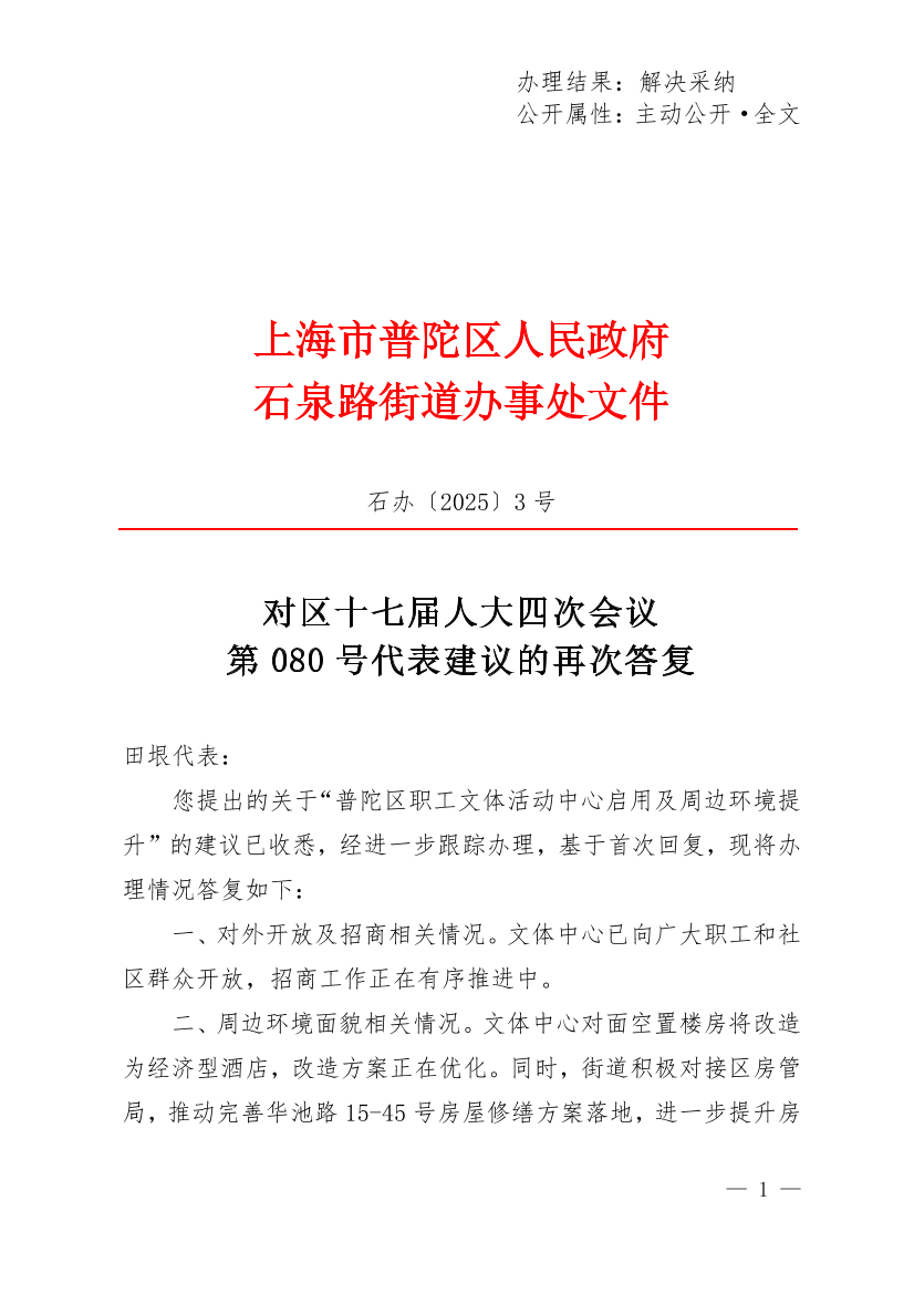 您提出的关于“普陀区职工文体活动中心启用及周边环境提升”的建议已收悉,经进一步跟踪办理,基于首次回复,现将办理情况答复如下: