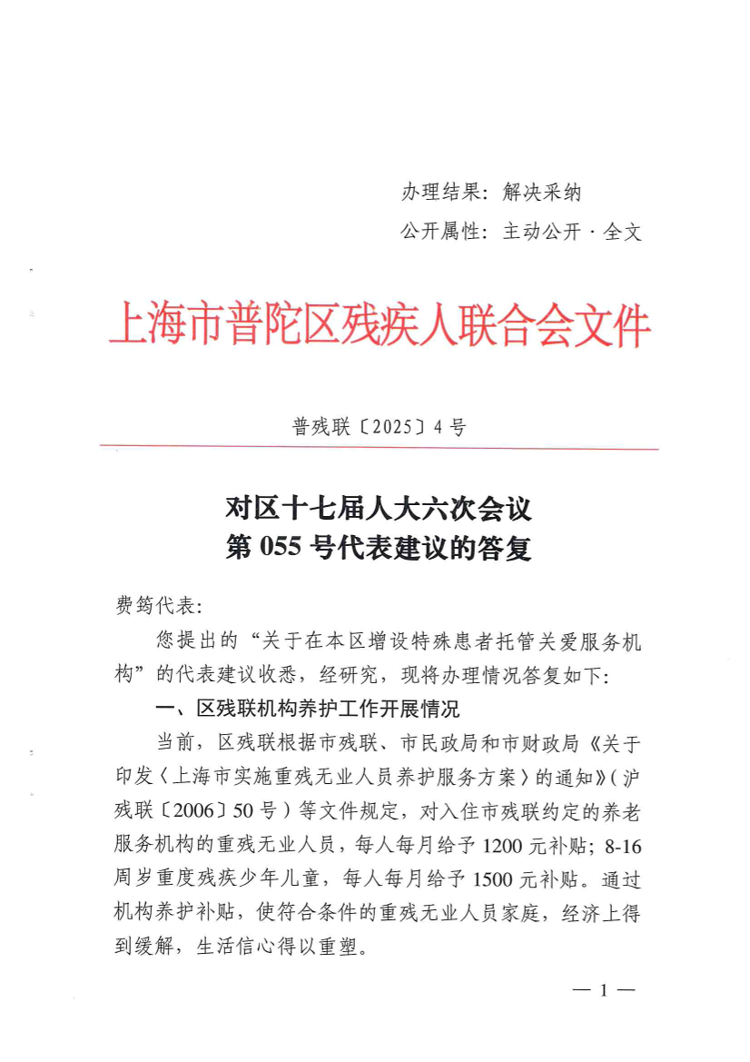 您提出的“关于在本区增设特殊患者托管关爱服务机构”的代表建议收悉,经研究,现将办理情况答复如下: