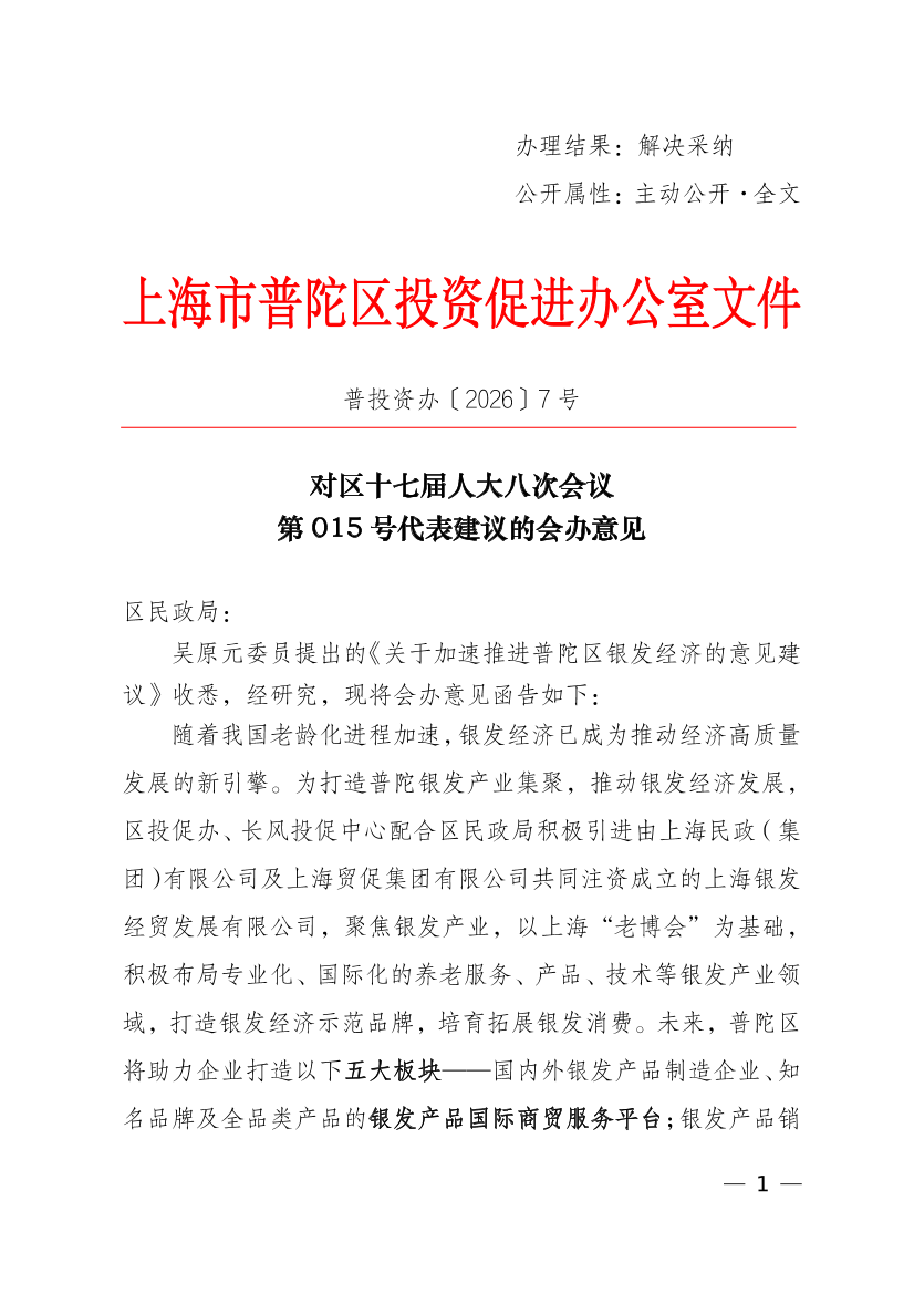 吴原元委员提出的《关于加速推进普陀区银发经济的意见建议》收悉,经研究,现将会办意见函告如下:
