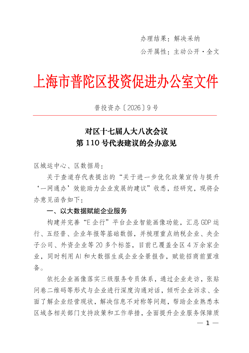 关于查道存代表提出的“关于进一步优化政策宣传与提升‘一网通办’效能助力企业发展的建议”收悉,经研究,现将会办意见函告如下:
