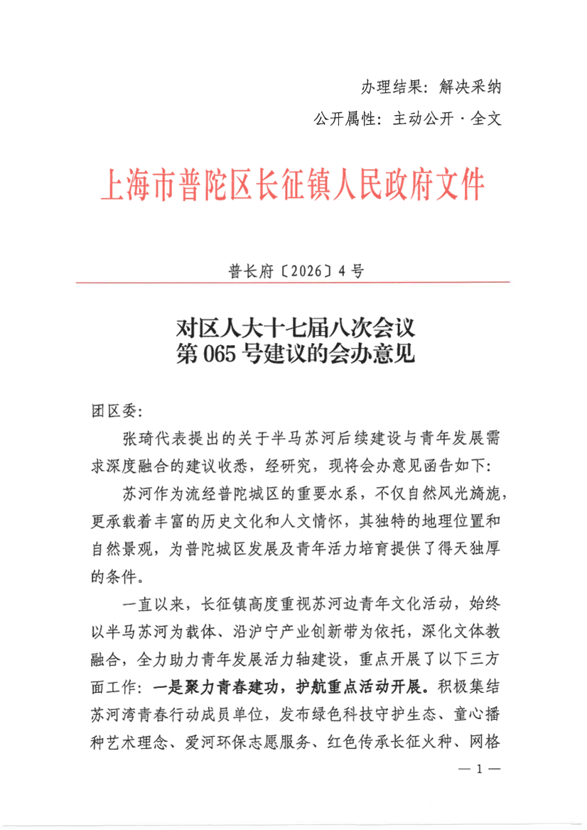 张琦代表提出的关于半马苏河后续建设与青年发展需求深度融合的建议收悉,经研究,现将会办意见函告如下: