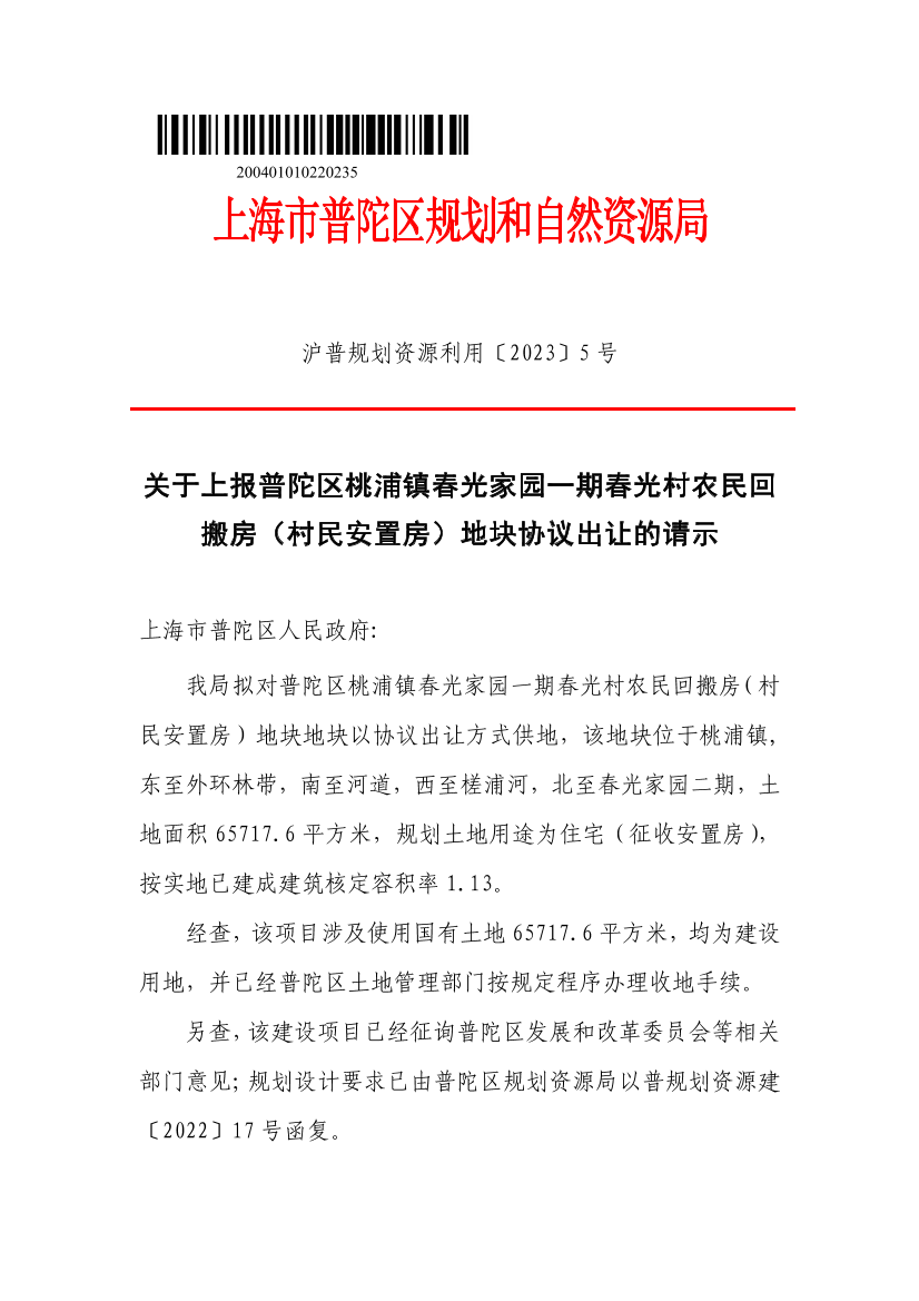 关于上报普陀区桃浦镇春光家园一期春光村农民回搬房(村民安置房)地块协议出让的请示