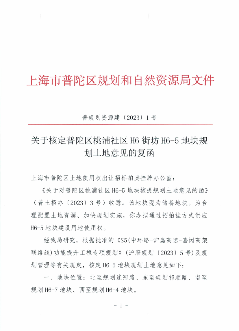 经我局研究,根据批准的《S5(中环路-沪嘉高速-嘉闵高架联络线)功能提升工程专项规划》(沪府规划〔2023〕5号)及规划管理等有关规定,核定H6-5地块规划土地意见如下:
