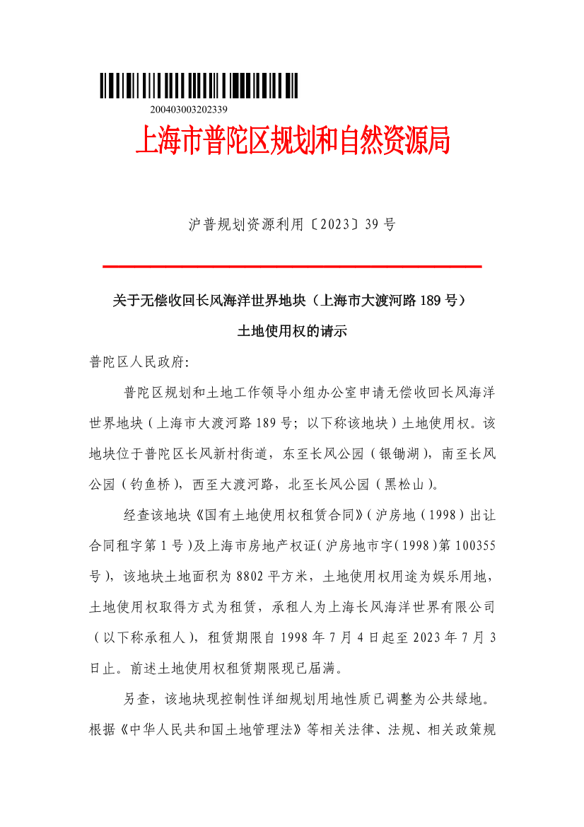 关于无偿收回长风海洋世界地块(上海市大渡河路189号)土地使用权的请示