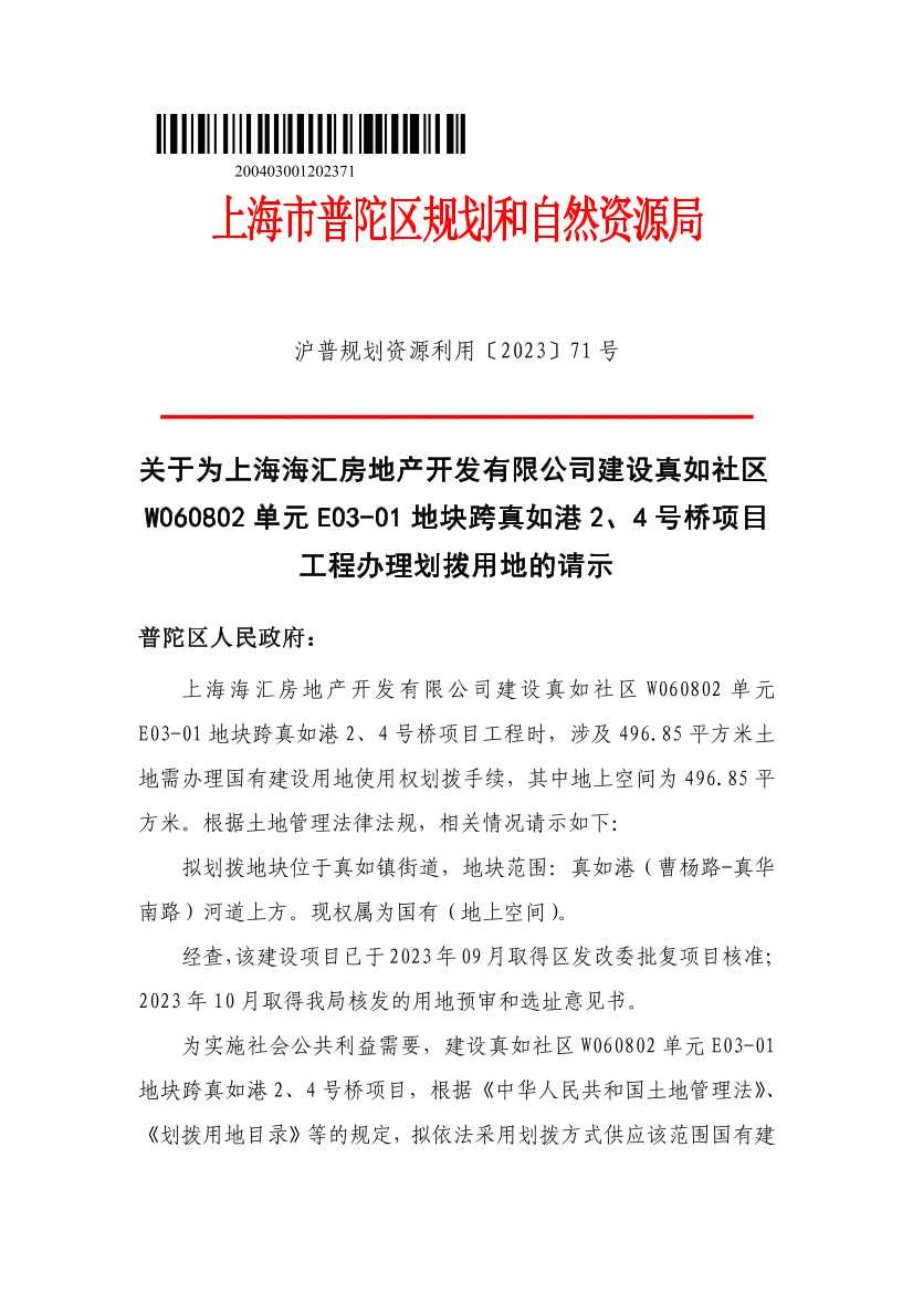 关于为上海海汇房地产开发有限公司建设真如社区W060802单元E03-01地块跨真如港2、4号桥项目工程办理划拨用地的请示
