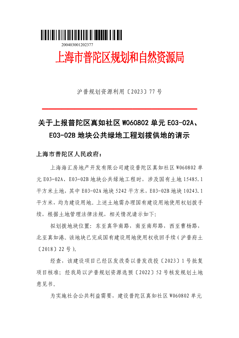 关于上报普陀区真如社区W060802单元E03-02A、E03-02B地块公共绿地工程划拨供地的请示