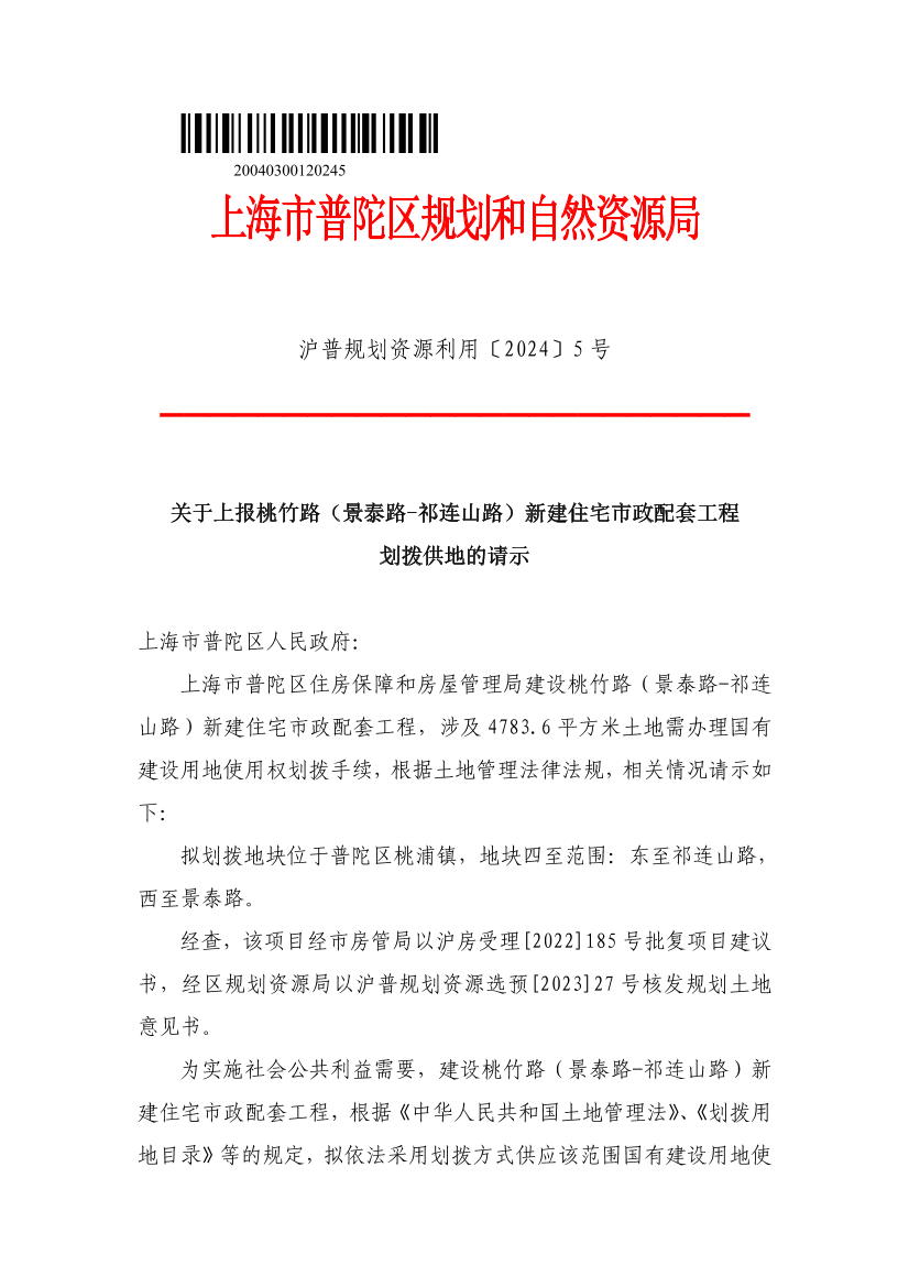 上海市普陀区住房保障和房屋管理局建设桃竹路(景泰路-祁连山路)新建住宅市政配套工程,涉及4783.6平方米土地需办理国有 建设用地使用权划拨手续,根据土地管理法律法规,相关情况请示如下: