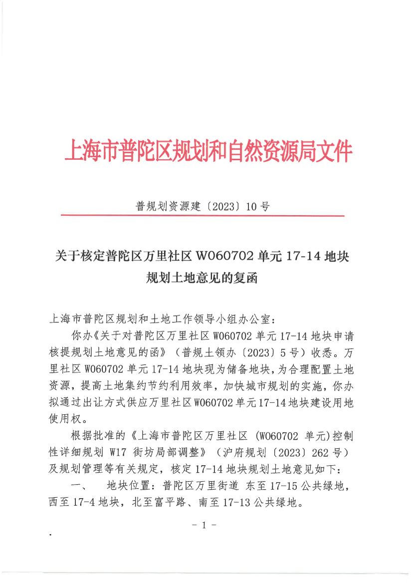 根据批准的《上海市普陀区万里社区 (W060702单元)控制性详细规划W17街坊局部调整》(沪府规划〔2023〕262号)及规划管理等有关规定,核定17-14地块规划土地意见如下: