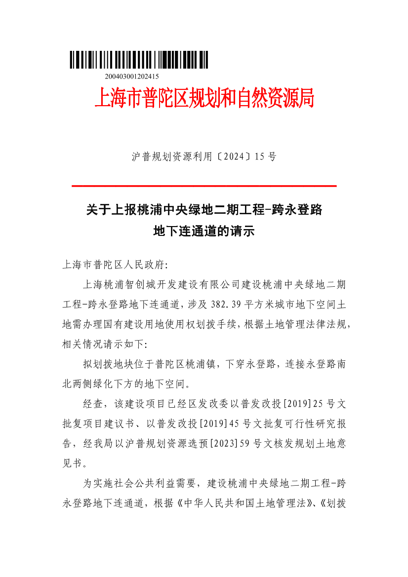 上海桃浦智创城开发建设有限公司建设桃浦中央绿地二期工程-跨永登路地下连通道,涉及382.39平方米城市地下空间土地需办理国有建设用地使用权划拨手续,根据土地管理法律法规,相关情况请示如下: