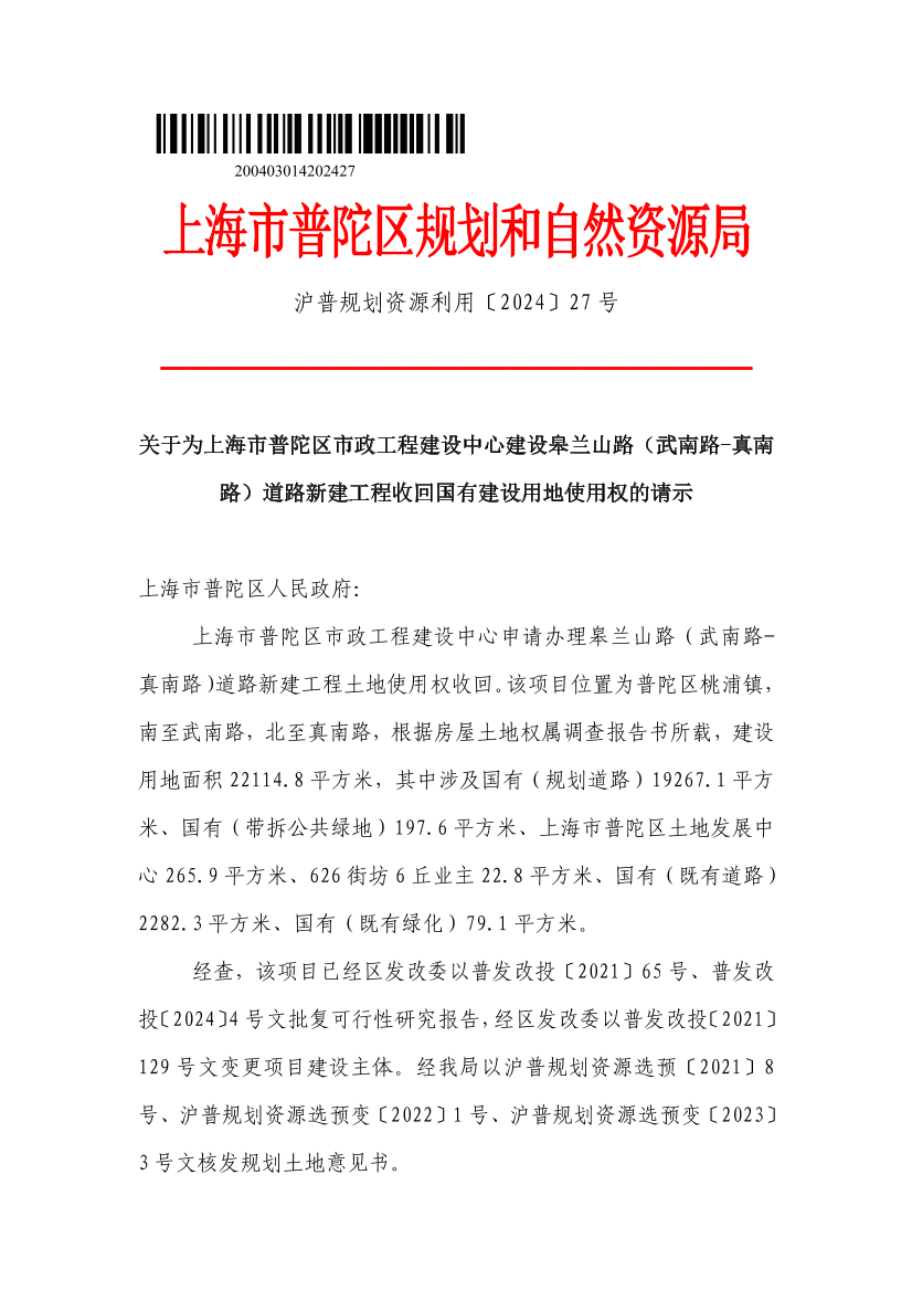 关于为上海市普陀区市政工程建设中心建设皋兰山路(武南路-真南路)道路新建工程收回国有建设用地使用权的请示