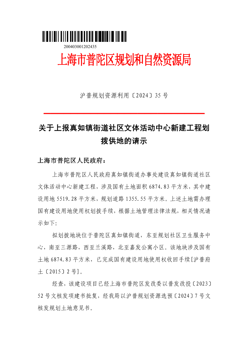 关于上报真如镇街道社区文体活动中心新建工程划拨供地的请示