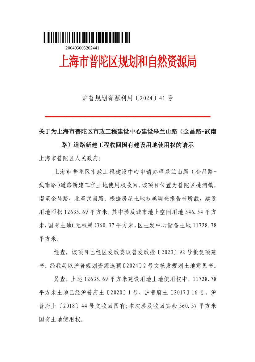 关于为上海市普陀区市政工程建设中心建设皋兰山路(金昌路-武南路)道路新建工程收回国有建设用地使用权的请示