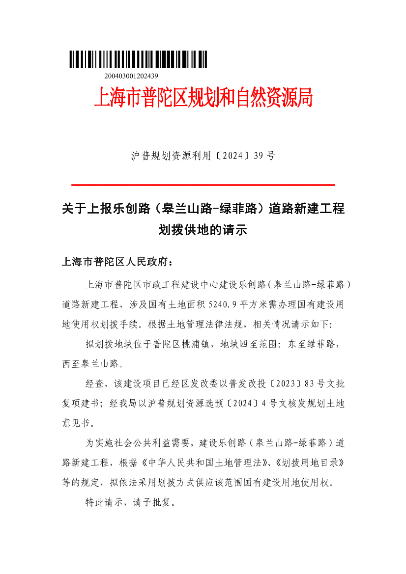 上海市普陀区市政工程建设中心建设乐创路(皋兰山路-绿菲路) 道路新建工程,涉及国有土地面积5240.9平方米需办理国有建设用地使用权划拨手续。根据土地管理法律法规,相关情况请示如下: