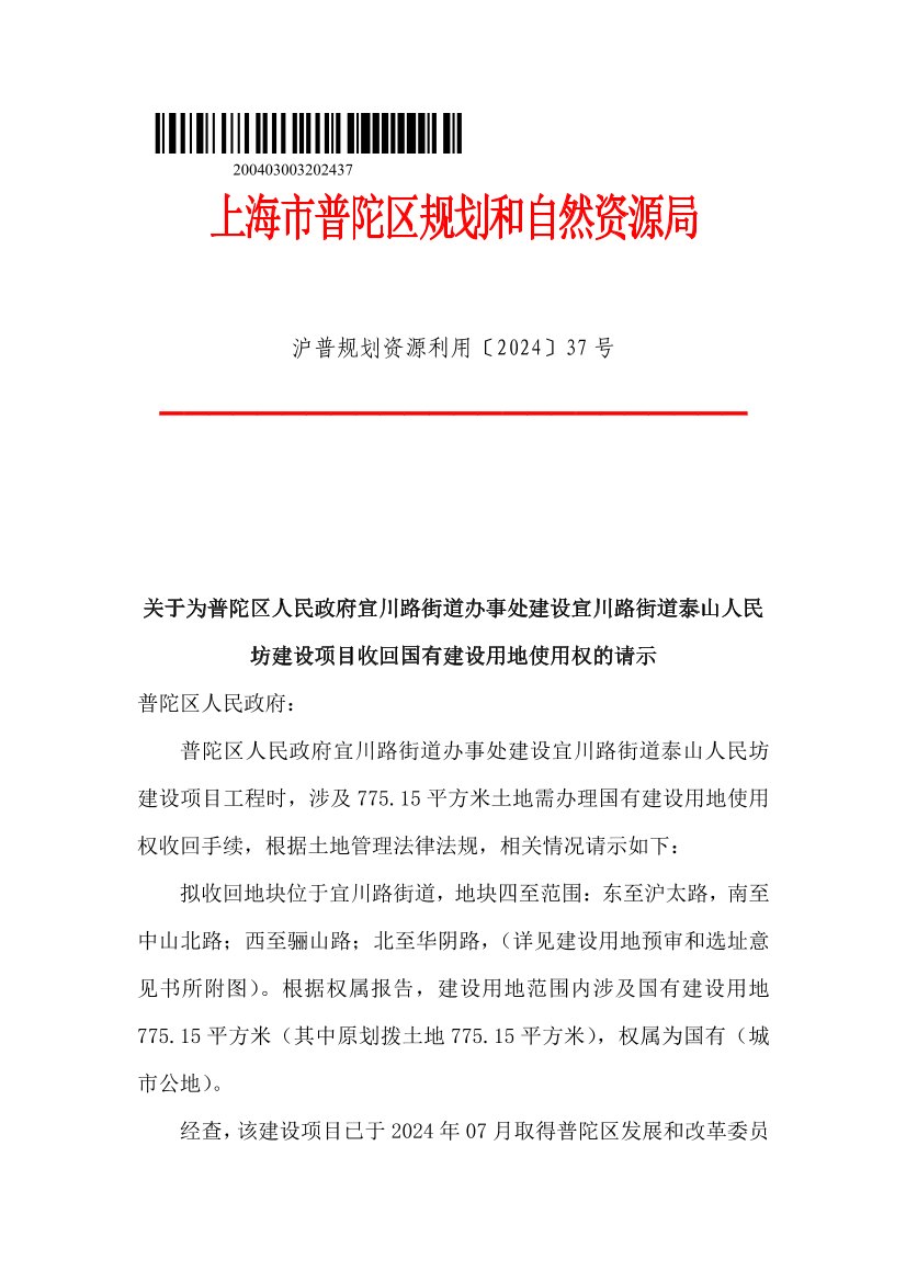 普陀区人民政府宜川路街道办事处建设宜川路街道泰山人民坊建设项目工程时,涉及775.15平方米土地需办理国有建设用地使用权收回手续,根据土地管理法律法规,相关情况请示如下: