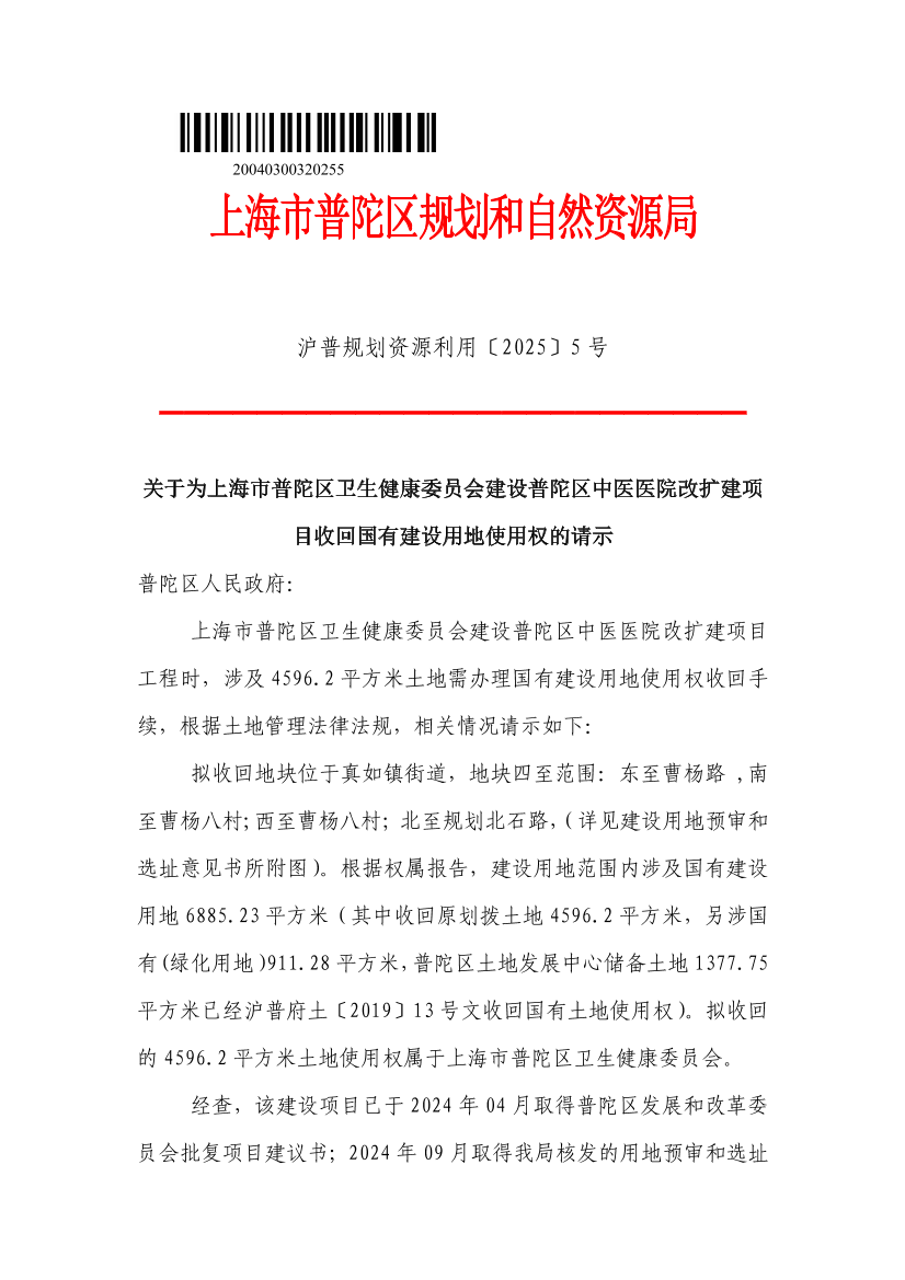 上海市普陀区卫生健康委员会建设普陀区中医医院改扩建项目工程时,涉及4596.2平方米土地需办理国有建设用地使用权收回手续,根据土地管理法律法规,相关情况请示如下:
